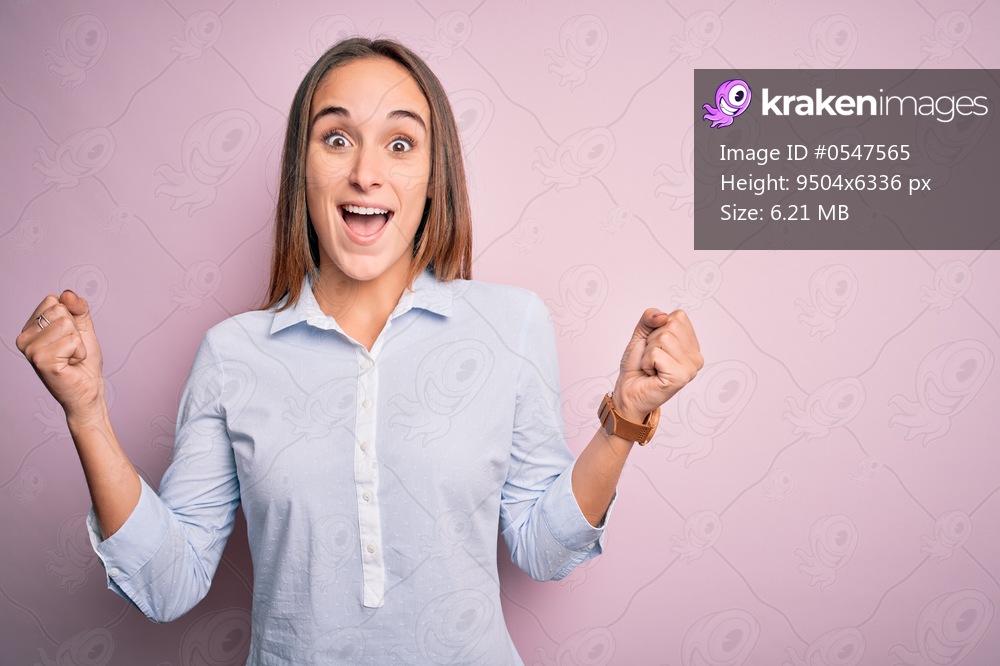 Young beautiful businesswoman wearing elegant shirt standing over isolated pink background celebrating surprised and amazed for success with arms raised and open eyes. Winner concept. - Kraken Images