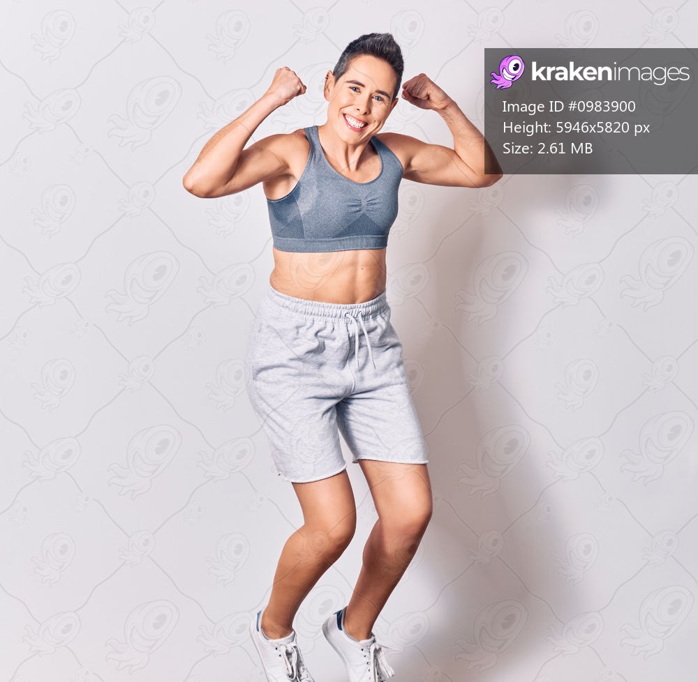 Young beautiful caucasian sportswoman wearing sportswear smiling happy. Jumping with smile on face over isolated white background