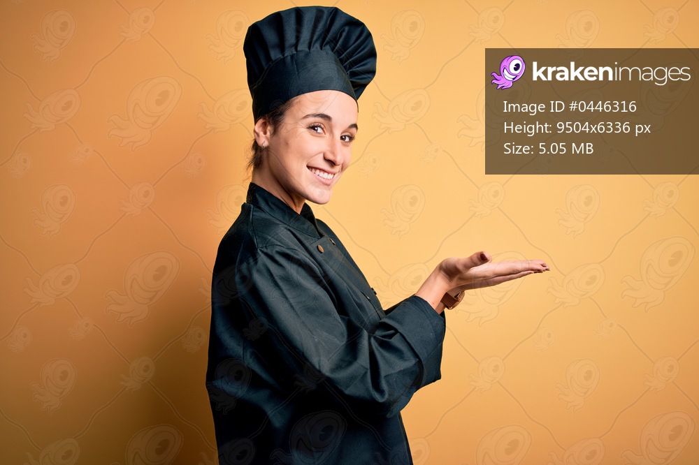 Young beautiful chef woman wearing cooker uniform and hat standing over yellow background pointing aside with hands open palms showing copy space, presenting advertisement smiling excited happy - Kraken Images