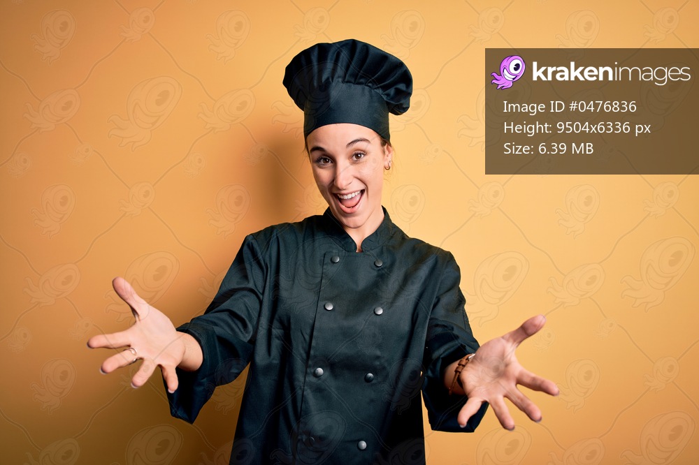 Young beautiful chef woman wearing cooker uniform and hat standing over yellow background smiling cheerful offering hands giving assistance and acceptance. - Kraken Images