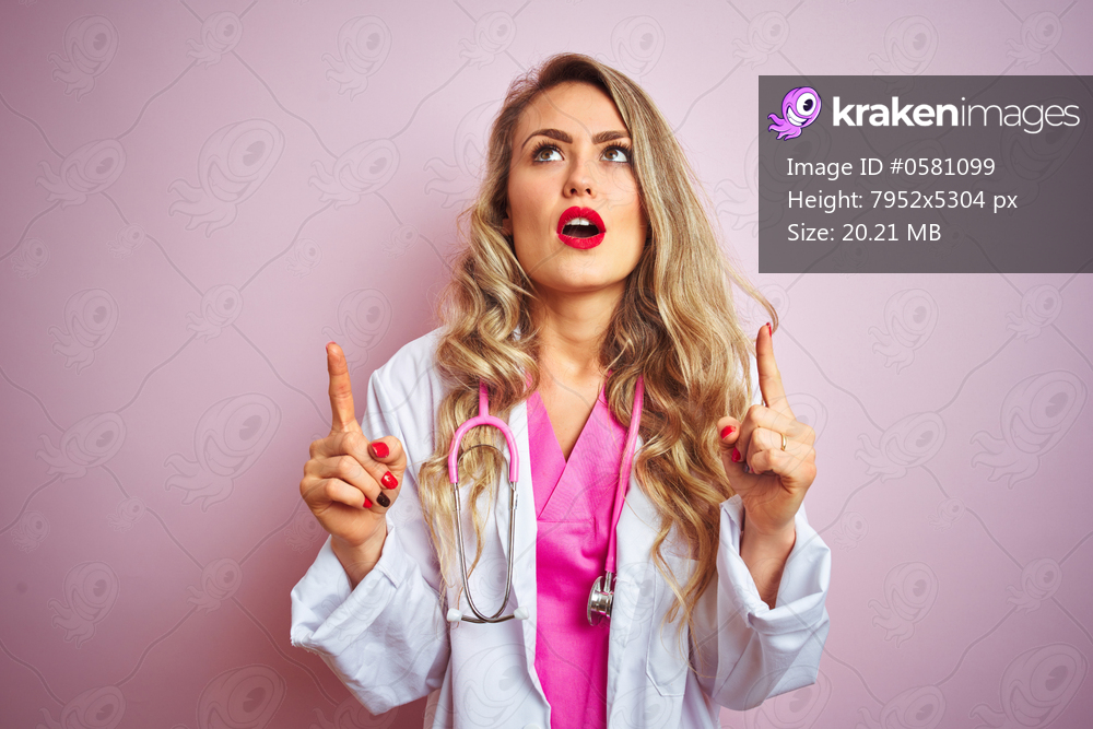 Young beautiful doctor woman using stethoscope over pink isolated background amazed and surprised looking up and pointing with fingers and raised arms. - Kraken Images