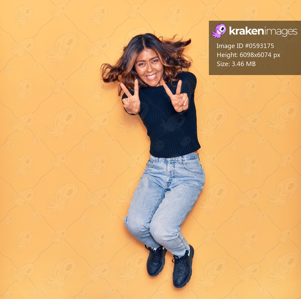 Young beautiful latin woman smiling happy. Jumping with smile on face doing victory sign over isolated yellow background