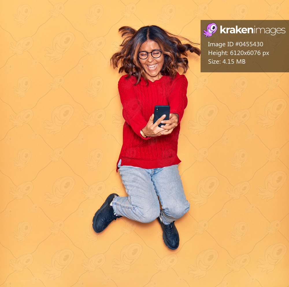 Young beautiful latin woman wearing glasses smiling happy. Jumping with smile on face make selfie by smartphone over isolated yellow background