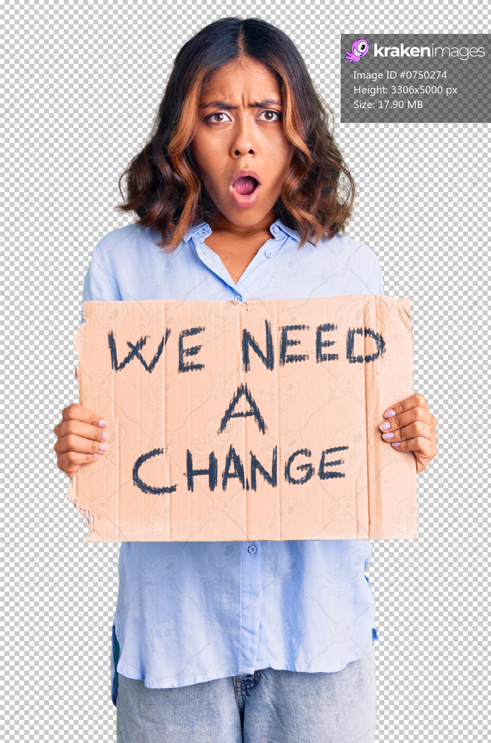 Young beautiful mixed race woman holding we need a change banner scared and amazed with open mouth for surprise, disbelief face