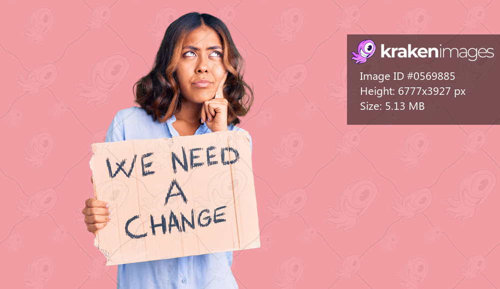 Young beautiful mixed race woman holding we need a change banner serious face thinking about question with hand on chin, thoughtful about confusing idea - Kraken Images