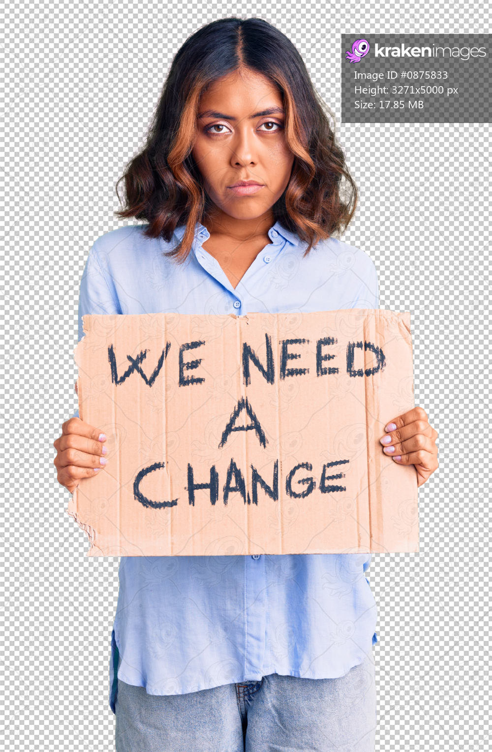 Young beautiful mixed race woman holding we need a change banner thinking attitude and sober expression looking self confident