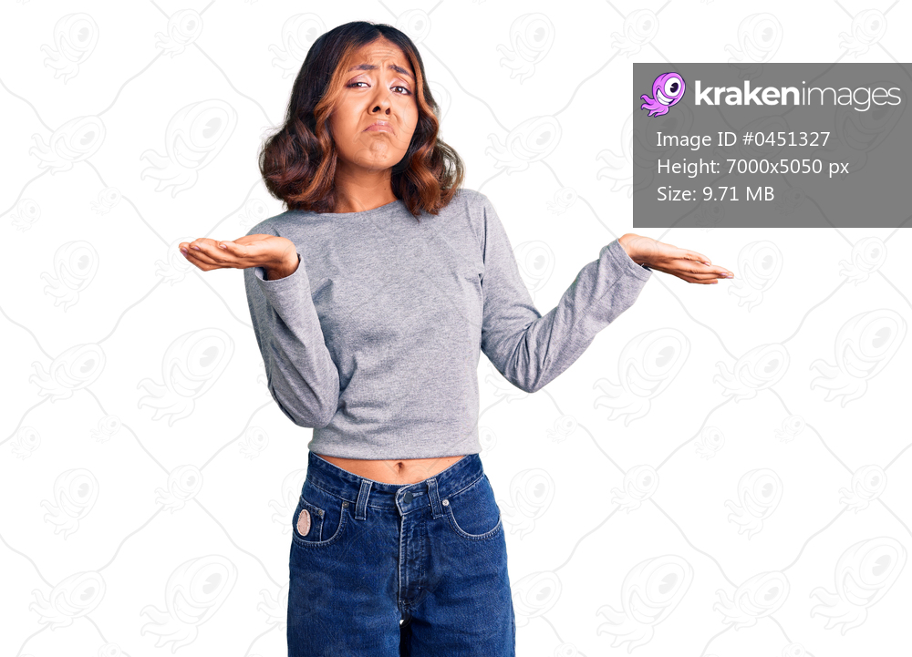Young beautiful mixed race woman wearing casual clothes clueless and confused expression with arms and hands raised. doubt concept.