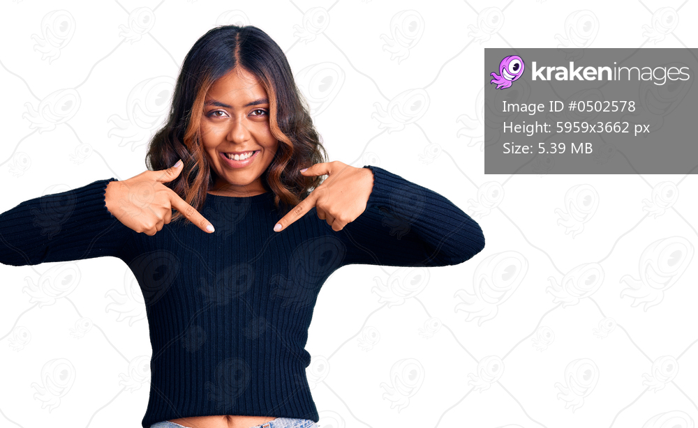 Young beautiful mixed race woman wearing casual clothes looking confident with smile on face, pointing oneself with fingers proud and happy.