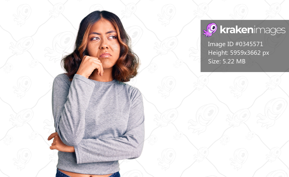 Young beautiful mixed race woman wearing casual clothes serious face thinking about question with hand on chin, thoughtful about confusing idea