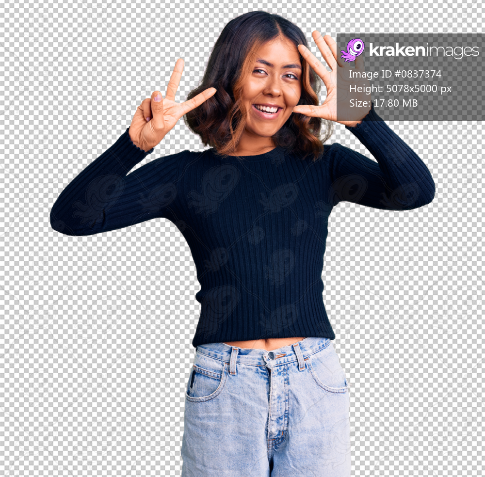 Young beautiful mixed race woman wearing casual clothes showing and pointing up with fingers number seven while smiling confident and happy.