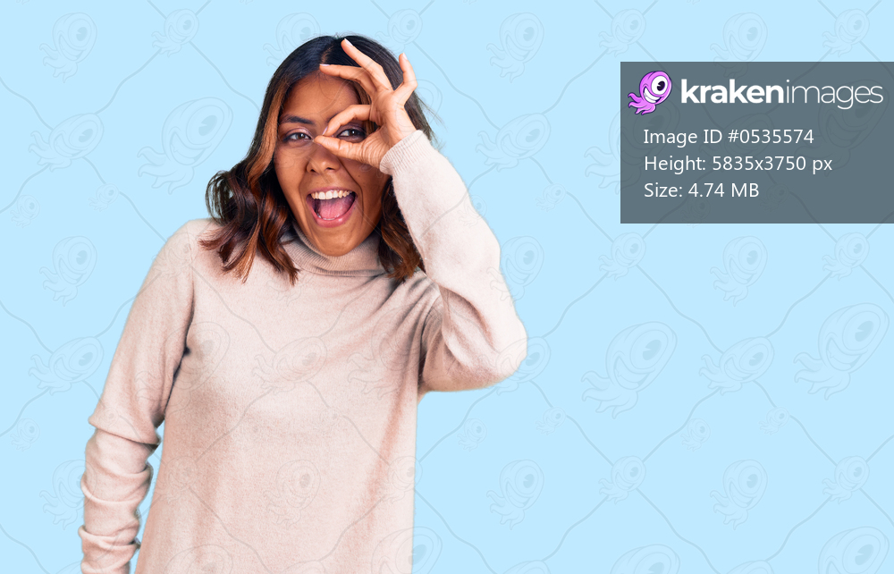 Young beautiful mixed race woman wearing winter turtleneck sweater doing ok gesture with hand smiling, eye looking through fingers with happy face.