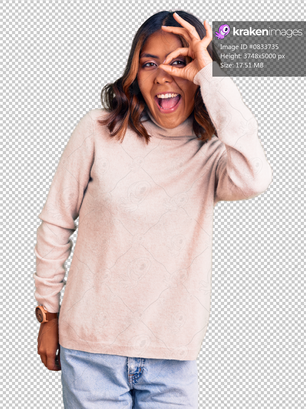 Young beautiful mixed race woman wearing winter turtleneck sweater doing ok gesture with hand smiling, eye looking through fingers with happy face.