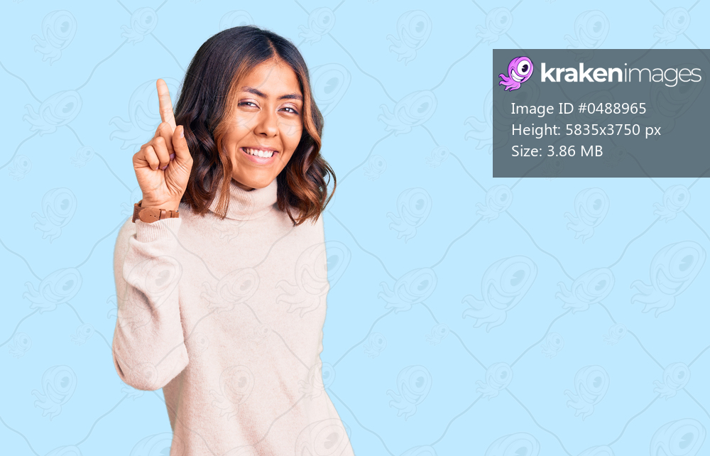 Young beautiful mixed race woman wearing winter turtleneck sweater pointing finger up with successful idea. exited and happy. number one.