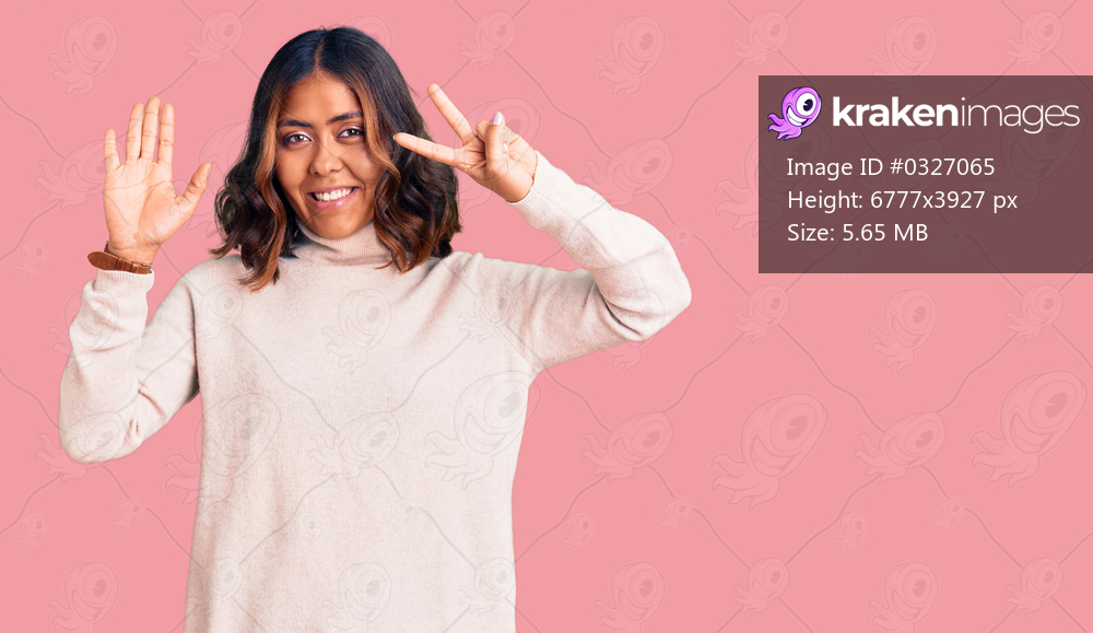 Young beautiful mixed race woman wearing winter turtleneck sweater showing and pointing up with fingers number seven while smiling confident and happy. - Kraken Images