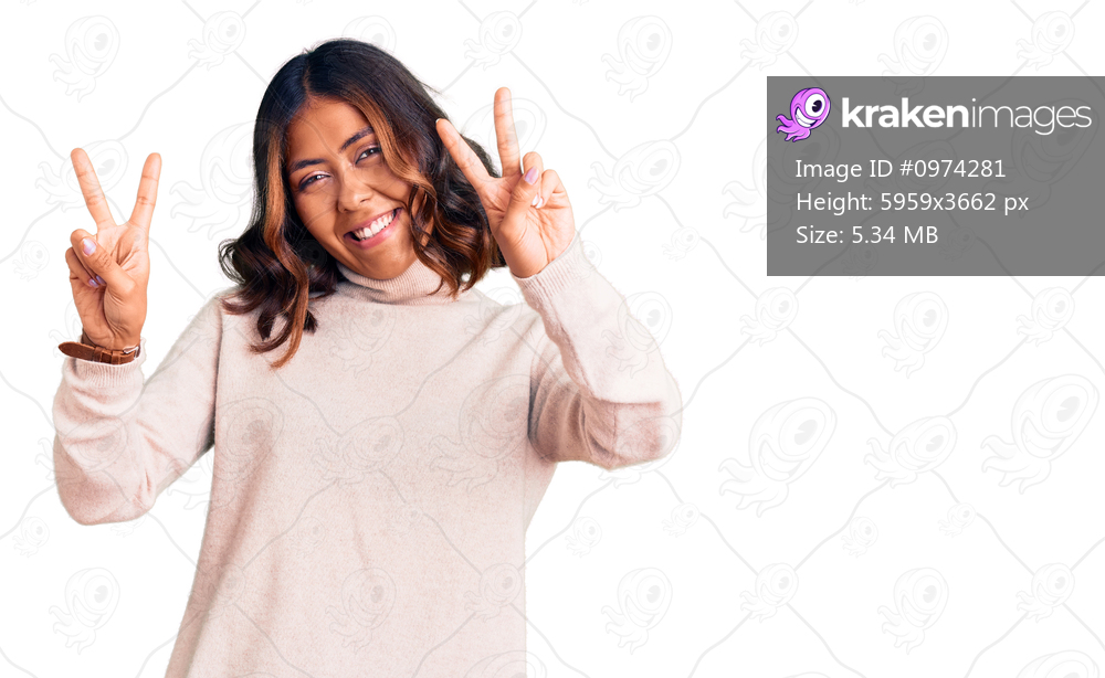 Young beautiful mixed race woman wearing winter turtleneck sweater smiling with tongue out showing fingers of both hands doing victory sign. number two. - Kraken Images