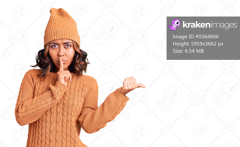Young beautiful mixed race woman wearing wool sweater and winter hat asking to be quiet with finger on lips pointing with hand to the side. silence and secret concept. - Kraken Images