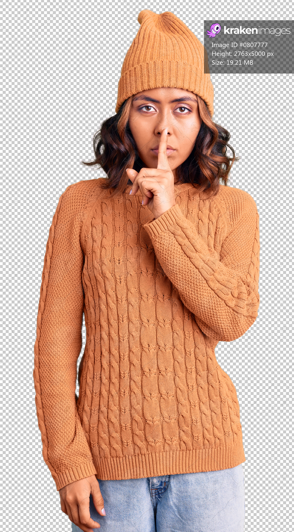 Young beautiful mixed race woman wearing wool sweater and winter hat asking to be quiet with finger on lips. silence and secret concept.