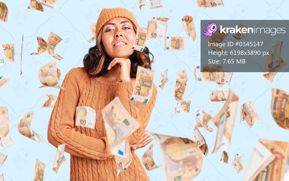 Young beautiful mixed race woman wearing wool sweater and winter hat with hand on chin thinking about question, pensive expression. smiling and thoughtful face. doubt concept. - Kraken Images