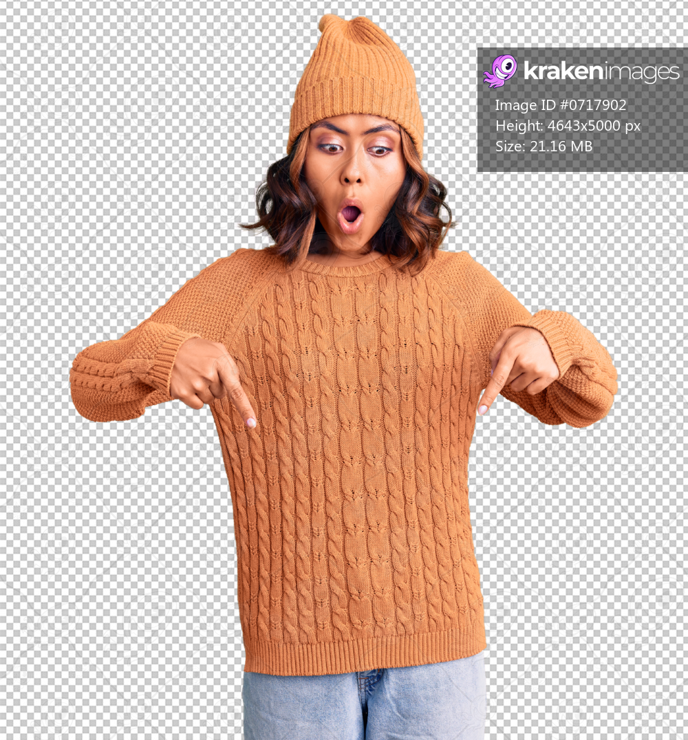 Young beautiful mixed race woman wearing wool sweater and winter hat pointing down with fingers showing advertisement, surprised face and open mouth
