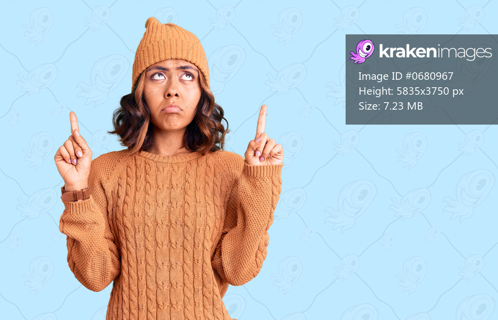 Young beautiful mixed race woman wearing wool sweater and winter hat pointing up looking sad and upset, indicating direction with fingers, unhappy and depressed. - Kraken Images