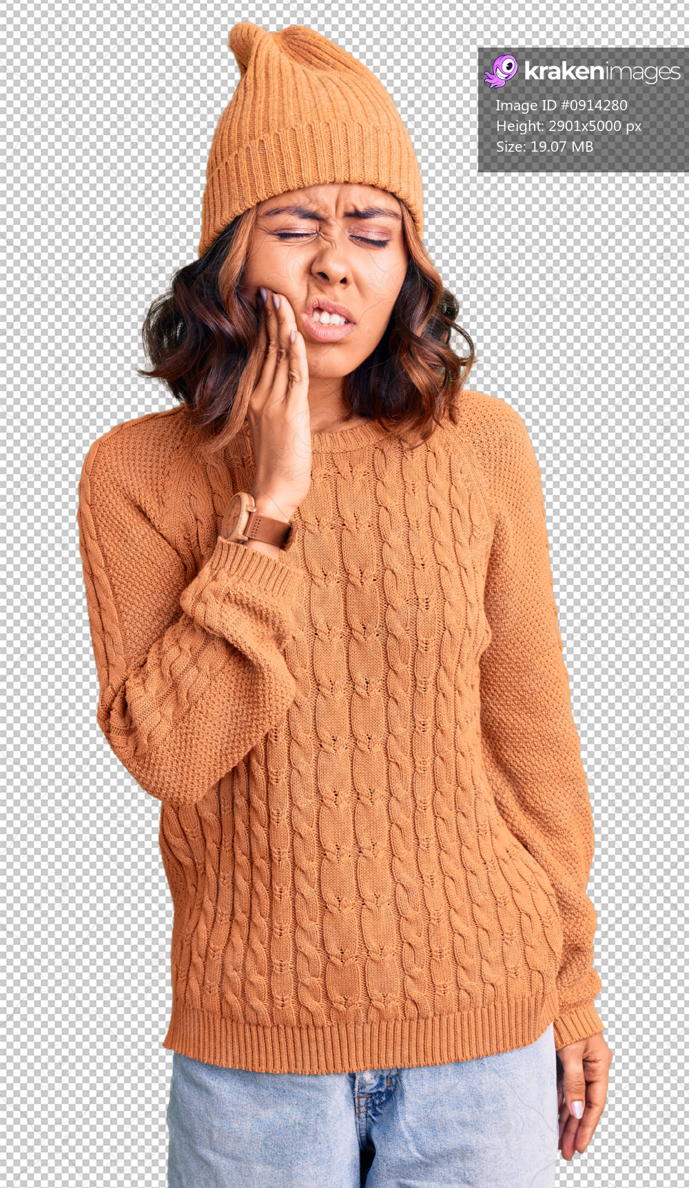 Young beautiful mixed race woman wearing wool sweater and winter hat touching mouth with hand with painful expression because of toothache or dental illness on teeth. dentist - Kraken Images