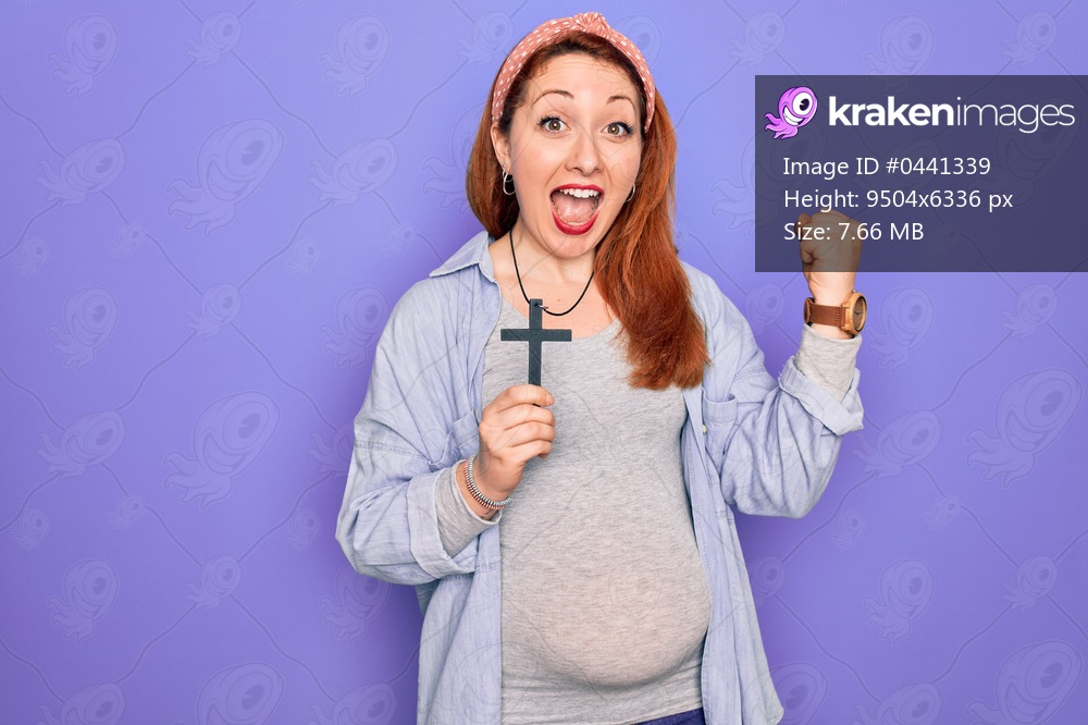 Young beautiful redhead pregnant woman expecting baby holding christian cross screaming proud and celebrating victory and success very excited, cheering emotion - Kraken Images