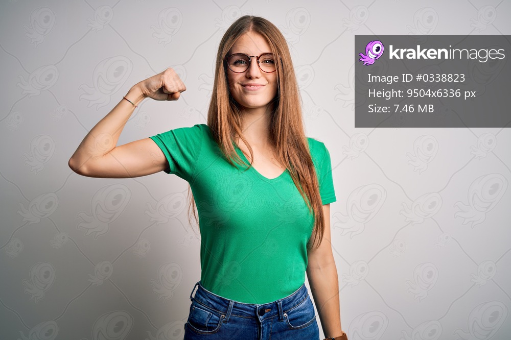 Young beautiful redhead woman wearing casual green t-shirt and glasses over white background Strong person showing arm muscle, confident and proud of power - Kraken Images