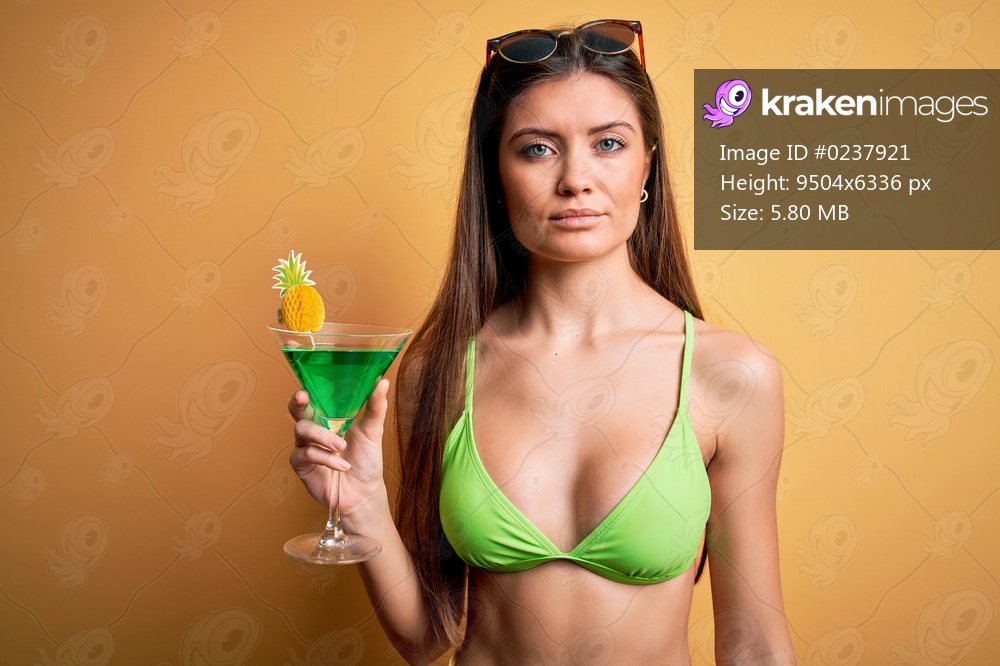 Young beautiful woman with blue eyes on vacation wearing bikini drinking cocktail with a confident expression on smart face thinking serious