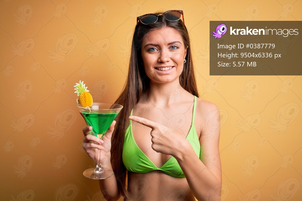 Young beautiful woman with blue eyes on vacation wearing bikini drinking cocktail very happy pointing with hand and finger