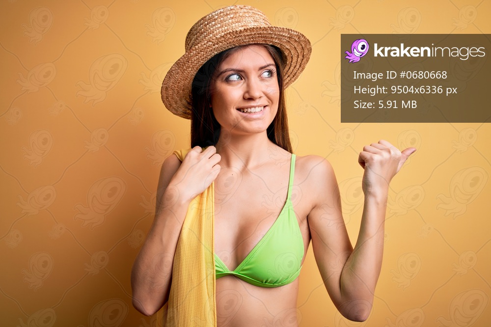 Young beautiful woman with blue eyes on vacation wearing bikini and hat holding towel pointing and showing with thumb up to the side with happy face smiling - Kraken Images