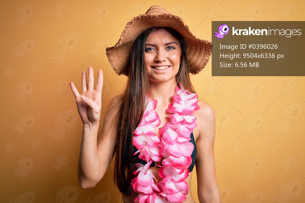 Young beautiful woman with blue eyes on vacation wearing bikini and hawaiian lei showing and pointing up with fingers number four while smiling confident and happy. - Kraken Images