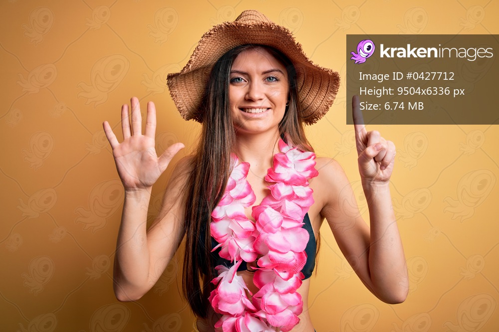 Young beautiful woman with blue eyes on vacation wearing bikini and hawaiian lei showing and pointing up with fingers number six while smiling confident and happy. - Kraken Images