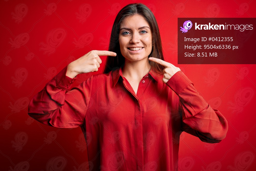 Young beautiful woman with blue eyes wearing casual shirt standing over red background smiling cheerful showing and pointing with fingers teeth and mouth. Dental health concept. - Kraken Images