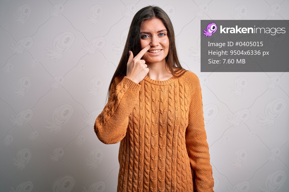 Young beautiful woman with blue eyes wearing casual sweater standing over white background Pointing with hand finger to face and nose, smiling cheerful. Beauty concept - Kraken Images