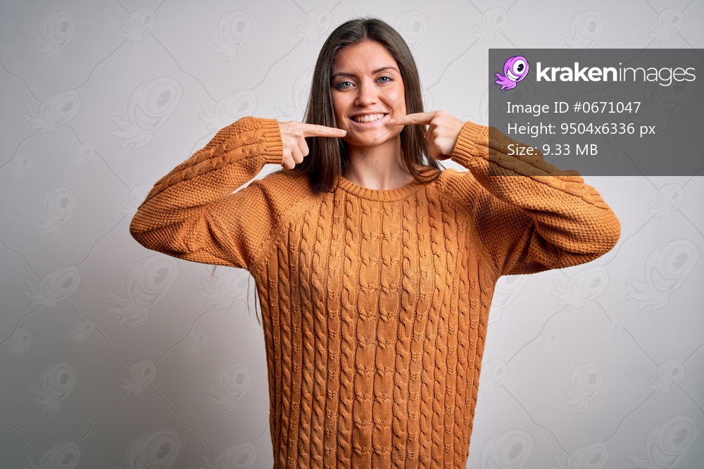Young beautiful woman with blue eyes wearing casual sweater standing over white background smiling cheerful showing and pointing with fingers teeth and mouth. Dental health concept. - Kraken Images