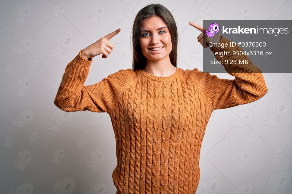 Young beautiful woman with blue eyes wearing casual sweater standing over white background smiling pointing to head with both hands finger, great idea or thought, good memory - Kraken Images