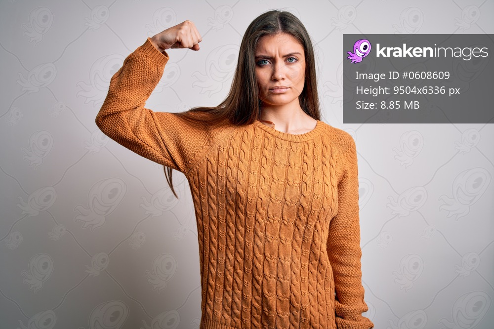 Young beautiful woman with blue eyes wearing casual sweater standing over white background Strong person showing arm muscle, confident and proud of power - Kraken Images