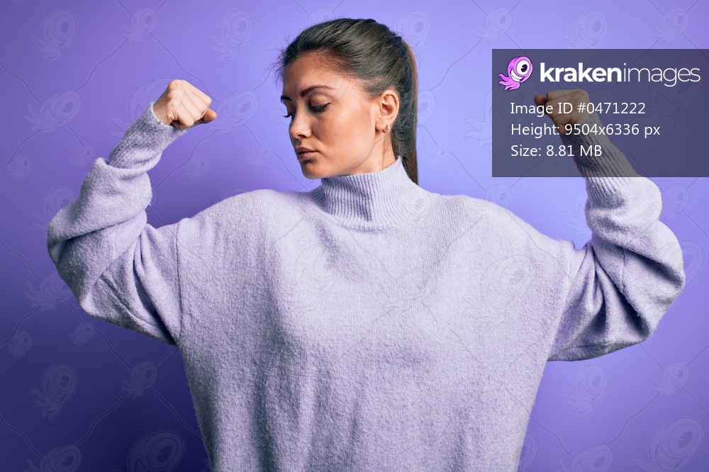 Young beautiful woman with blue eyes wearing casual turtleneck sweater over pink background showing arms muscles smiling proud. Fitness concept.