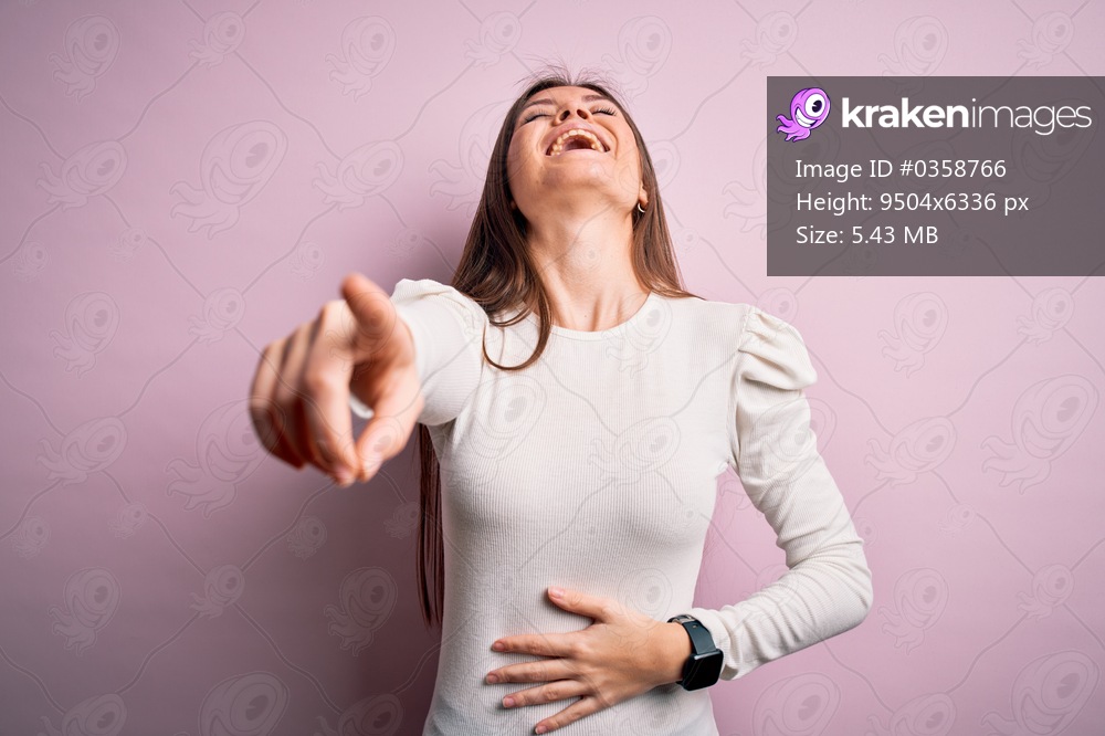 Young beautiful woman with blue eyes wearing casual white t-shirt over pink background laughing at you, pointing finger to the camera with hand over body, shame expression - Kraken Images