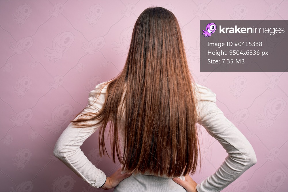 Young beautiful woman with blue eyes wearing casual white t-shirt over pink background standing backwards looking away with arms on body
