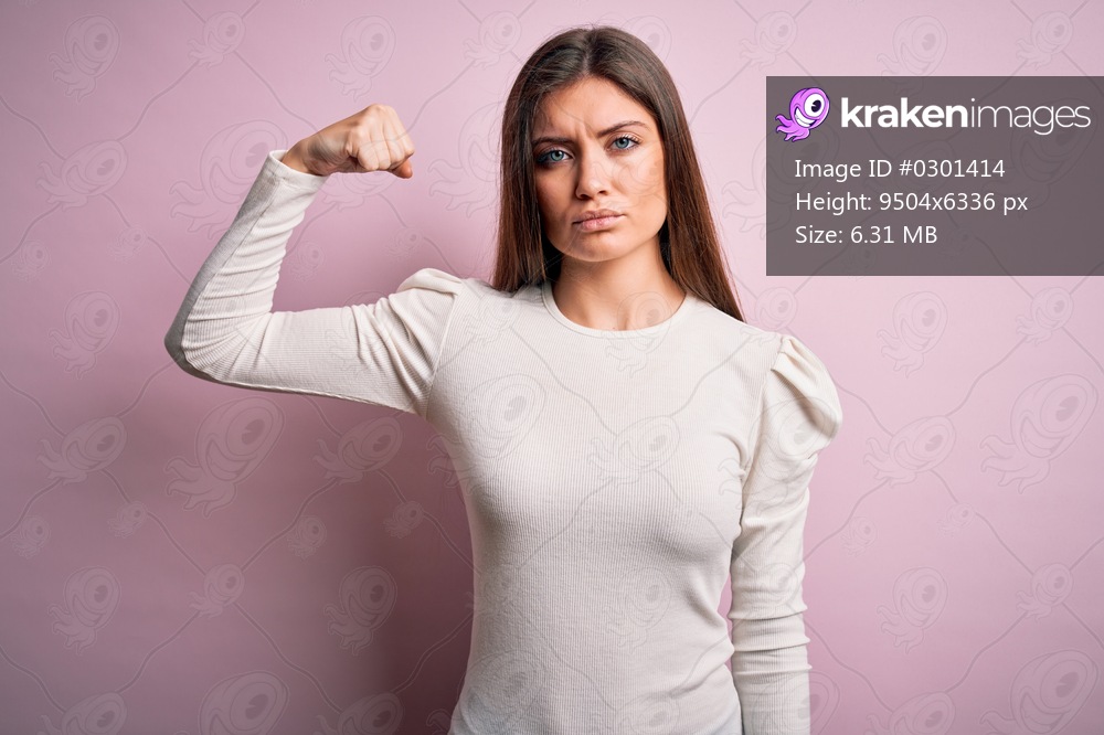 Young beautiful woman with blue eyes wearing casual white t-shirt over pink background Strong person showing arm muscle, confident and proud of power