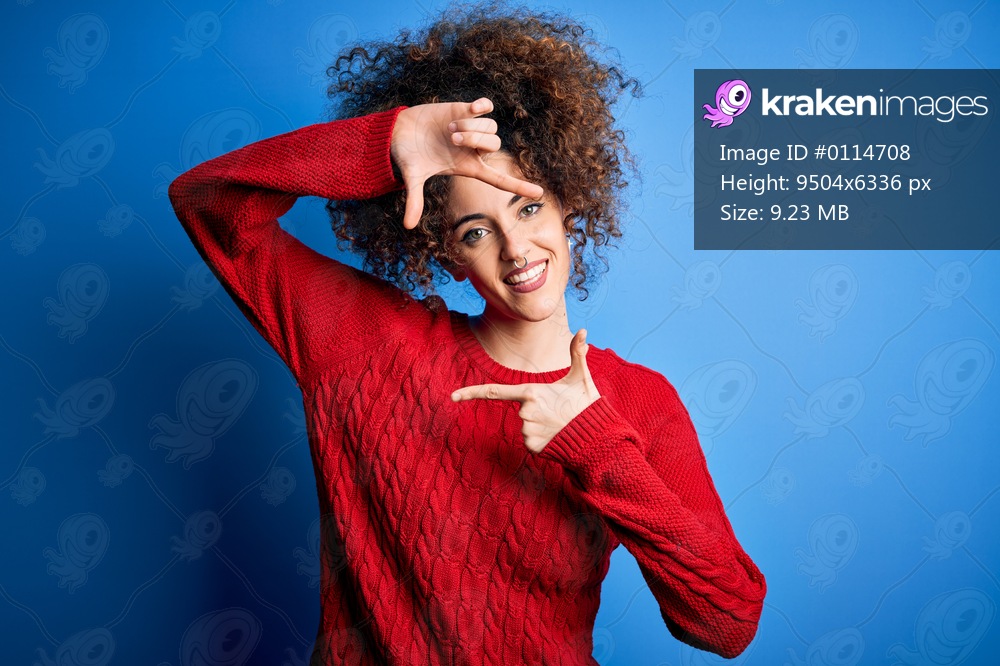 Young beautiful woman with curly hair and piercing wearing casual red sweater smiling making frame with hands and fingers with happy face. Creativity and photography concept. - Kraken Images