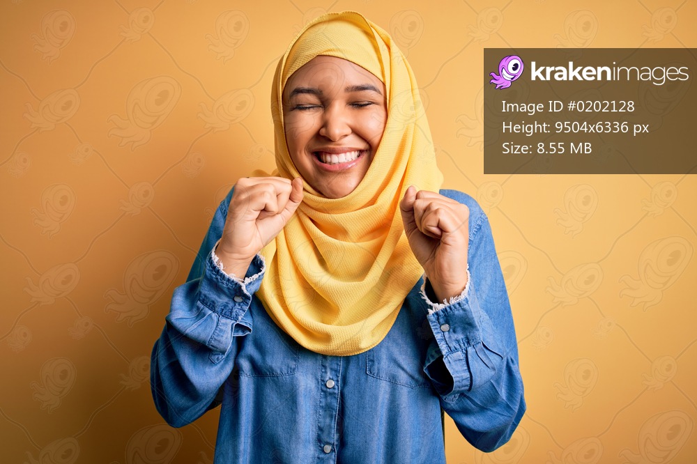 Young beautiful woman with curly hair wearing arab traditional hijab over yellow background excited for success with arms raised and eyes closed celebrating victory smiling. Winner concept. - Kraken Images
