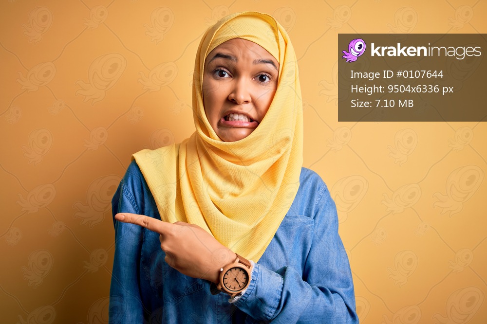 Young beautiful woman with curly hair wearing arab traditional hijab over yellow background Pointing aside worried and nervous with forefinger, concerned and surprised expression - Kraken Images