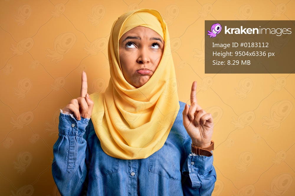 Young beautiful woman with curly hair wearing arab traditional hijab over yellow background Pointing up looking sad and upset, indicating direction with fingers, unhappy and depressed. - Kraken Images