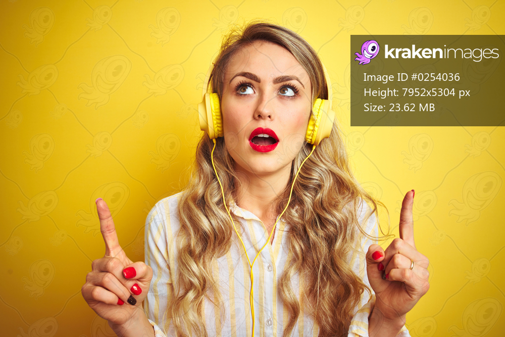 Young beautiful woman listening to music using headphones over yellow isolated background amazed and surprised looking up and pointing with fingers and raised arms. - Kraken Images