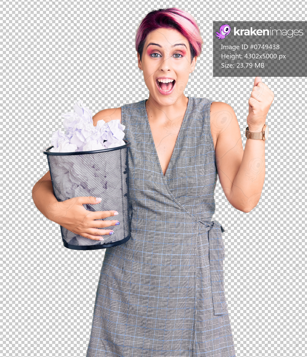 Young beautiful woman with pink hair holding paper bin full of crumpled papers screaming proud, celebrating victory and success very excited with raised arms - Kraken Images