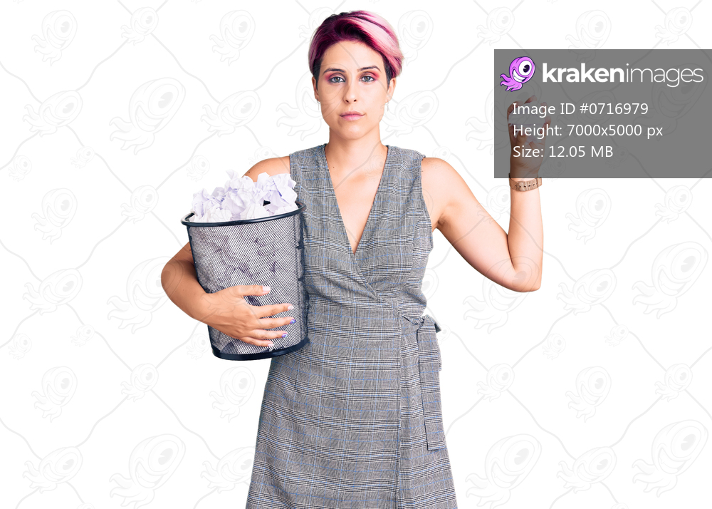 Young beautiful woman with pink hair holding paper bin full of crumpled papers thinking attitude and sober expression looking self confident