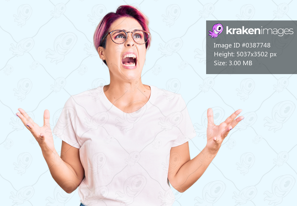 Young beautiful woman with pink hair wearing casual clothes and glasses crazy and mad shouting and yelling with aggressive expression and arms raised. frustration concept. - Kraken Images