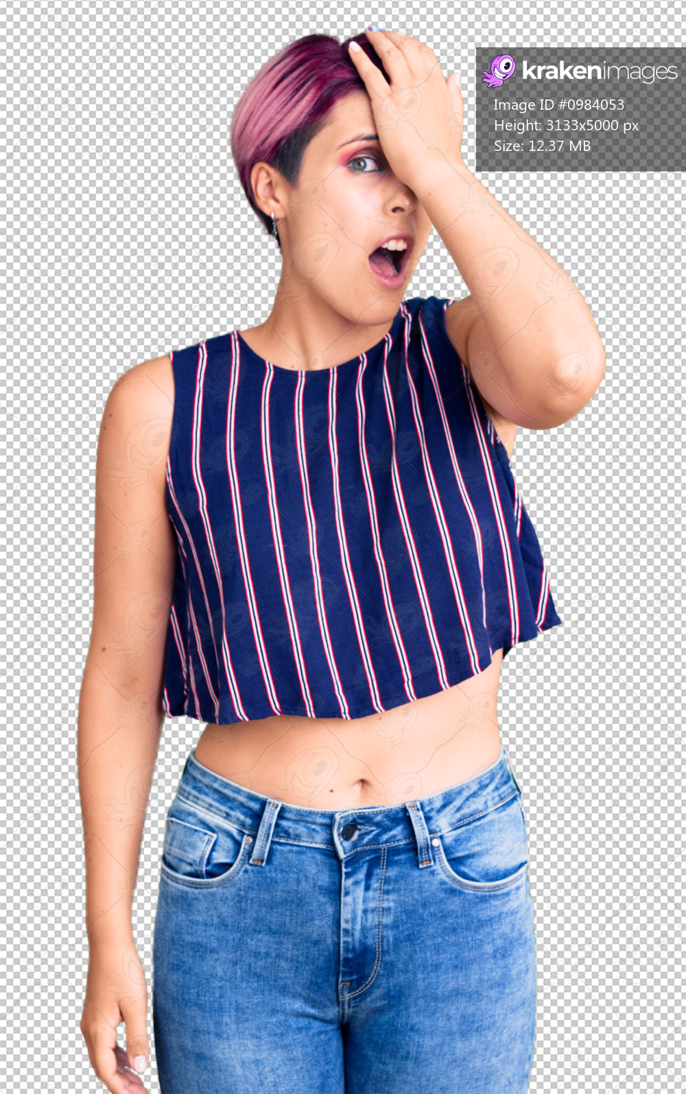 Young beautiful woman with pink hair wearing casual clothes surprised with hand on head for mistake, remember error. forgot, bad memory concept.